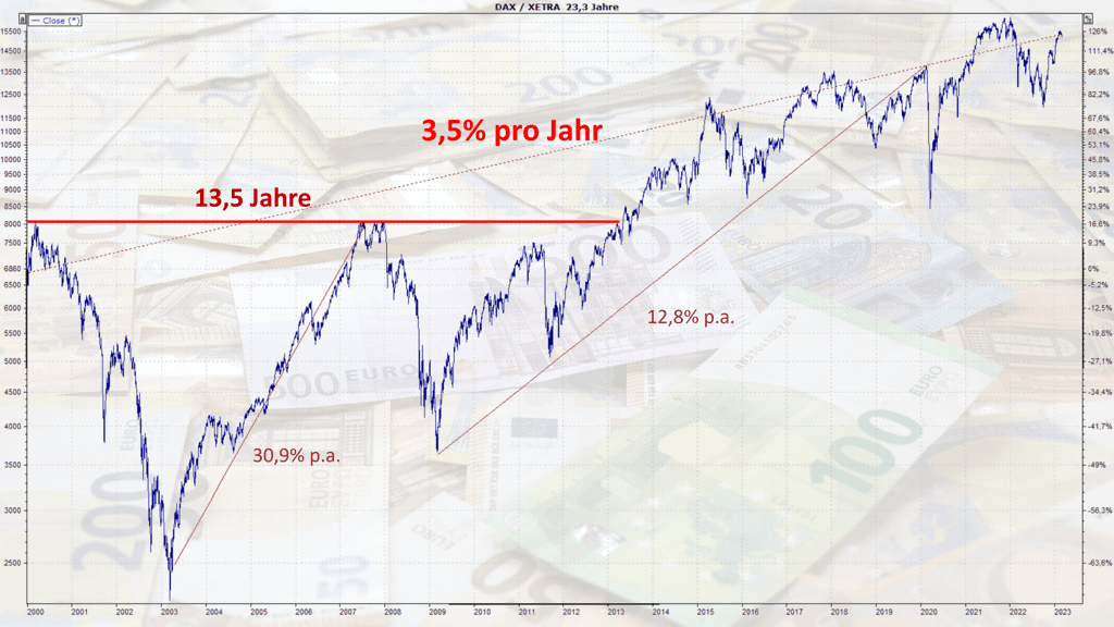 Wer im Jahr 2000 in den DAX investiert hat – und das waren aufgrund des vorhergehenden mehrjährigen Börsen-Booms ziemlich viele – musste 13 ½ Jahre warten, bis er oder sie das Geld nachhaltig zurück hatte.