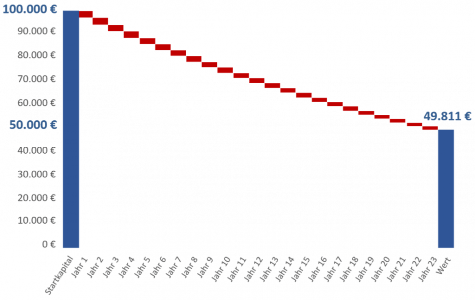Bei einer Inflation – Steigen der Preise – von z. B. 5% verliert Ihr Vermögen durch den negativen Zinseszinseffekt bereits nach 14 Jahren mehr als die Hälfte seines Wertes. Ist sie höher, geht es dementsprechend noch schneller.